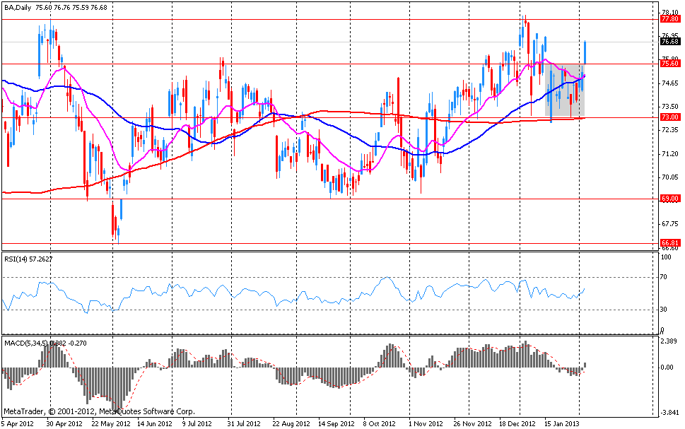 По итогам января акции BA упали, существенно отстав от динамики рынка (рост основных фондовых индексов США за январь составил около 5%). Сдерживающим фактором для акций BA были проблемы с Dreamliner-ом, было сообщено о возгорании на борту самолета. Согласно данным WSJ, Эксперты до сих пор не могут выяснить, что стало причиной возгорания, и это является причиной неопределенности относительно того, когда самолеты данной серии возобновят полеты.
