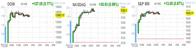 В данный момент почти все компоненты индекса DOW демонстрируют рост, в области нулевой отметки находятся только акции International Business Machines (IBM) и Alcoa (AA).