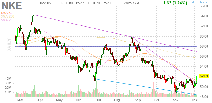 На текущий момент акции Nike(NKE) котируются по $52,09 (+3,24%)