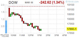 Все компоненты индекса DOW торгуются в минусе (30 из 30). Аутсайдером являются акции The Procter & Gamble Company (PG, -2.20%).