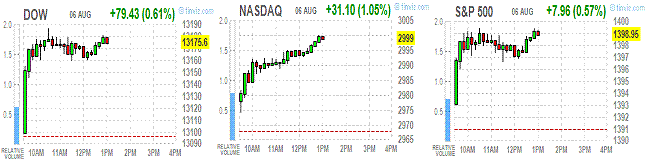 В составе индекса DOW все компоненты, за исключением двух, находятся в плюсе. Более 4% прибавили акции Kraft Foods Inc. (KFT, +4,03%) и Hewlett-Packard (HPQ, +4,05%). В отраслевом разрезе все сектора находятся в плюсе. Больше остальных вырос финансовый сектор (+2,7%).