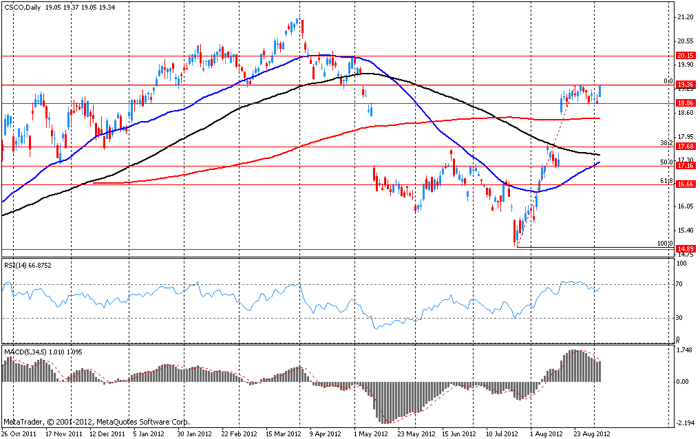 В составе индекса DOW все компоненты находятся в плюсе. Лидируют акции банковских учреждений: Bank of America (BAC, +4.40%) и JPMorgan Chase (JPM, +3.87%), а также Cisco Systems (CSCO, +3.89%).