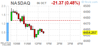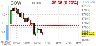Большая часть компонентов индекса DOW торгуется в минусовой зоне (21 из 30). Аутсайдером являются акции Nike, Inc. (NKE, -1.25%). Больше остальных выросли акции The Coca-Cola Company (KO, +1.09%).