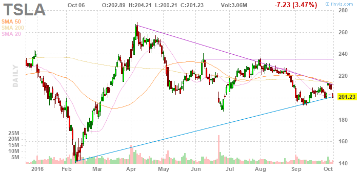 | Tesla Motors, Inc., NASDAQ | TSLA | 202.47 | -5.99(-2.8735%) | 50957 |