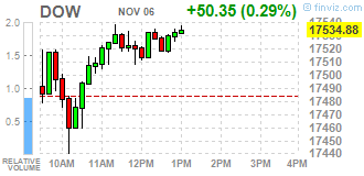 Компоненты индекса DOW торгуются преимущественно в плюсе (17 из 30). Аутсайдером являются акции American Express Company (АХР, -0.98%). Больше остальных выросли акции General Electric Company (GE, +1.98%).