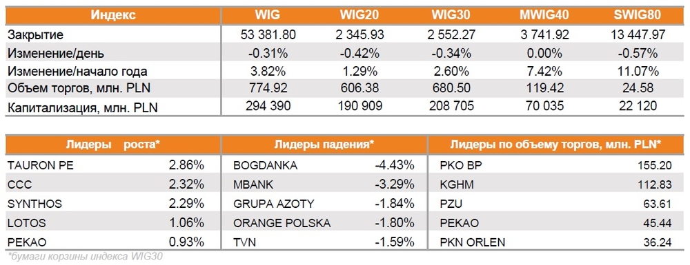 Падение индекса ликвидных бумаг WIG30 составило 0.34 %. Наиболее значительным снижением отметились бумаги таких компаний как BOGDANKA (WSE: LWB) и MBANK (WSE: MBK) - 4.43% и 3.29% соответственно. Напротив, максимальный рост показали бумаги TAURONPE (WSE: TPE) - 2.86%.