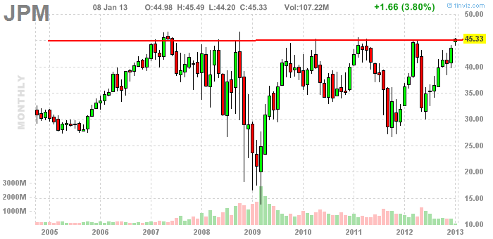 Если акции JPM в 2013 году все же сумеют преодолеть данный уровень и закрепиться выше него, это окажет существенную поддержку финансовому сектору в частности и фондовому рынку США в целом.