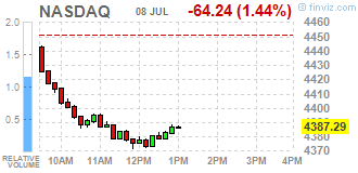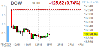 Компоненты индекса DOW торгуются преимущественно в минусе, и только акции Wal-Mart Stores Inc. (WMT, +0.84%), Procter & Gamble Co. (PG, +0.54%) и Exxon Mobil (XOM, +0.30%) находятся выше нулевой отметки. Наибольшее падение демонстрируют акции Verizon Communications Inc. (VZ, -1.90%).