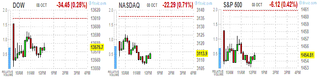 Объем торгов торгов сегодня ниже среднего на фоне празднования Дна Колумба, в связи с чем сегодня в США не работает рынок облигаций и кредитный рынок.Все основные экономические сектора находятся в красной зоне. Максимальные потери несет высокотехнологический сектор (-0,9%).