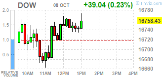 Большинство компонентов индекса DOW торгуются в плюсовой зоне (17 из 30). Аутсайдером являются акции AT&T, Inc. (Т, -1.53%). Больше остальных выросли акции UnitedHealth Group Incorporated (UNH, +1.33%).