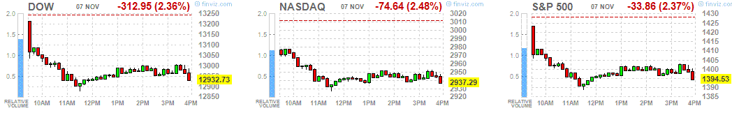 S&P -33.86 1,394.53 -2.37%Начав сессию в существенном минусе, индексы продолжили снижаться, в результате чего завершили сессию существенным падением