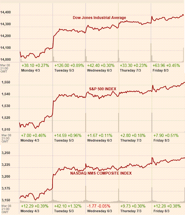 Статистика по занятости была представлена отчетом от ADP и правительственными данными. Первым вышедшим отчетом были данные по занятости от ADP, согласно которым занятость в частном секторе американской экономики выросла в феврале на 198 тыс, превзойдя ожидания аналитиков. Позитивные данные по рынку труда США указали на продолжающийся рост занятости, несмотря на экономические и бюджетные трудности, создаваемые безрезультатными дебатами в Вашингтоне по бюджету. Позже эту динамику подтвердили правительственные данные, согласно которым число занятых в несельскохозяйственных отраслях экономики США в феврале выросло на 236 тыс человек, что значительно больше среднего прогноза аналитиков 158 тыс. Департамент труда также сообщил, что уровень безработицы снизился на 0,2%, опустившись при этом до отметки 7,7%, и показав самое низкое значение с конца 2008 года.Несмотря на существенный рост и обновление максимумов, стоит отметить, что объем торгов на рынке продолжают снижаться. Согласно данным BATS Global Markets, средний объем торгов на американских фондовых площадках за последние пять торговых сессий по 8 марта включительно составил составил 6,41 млрд контрактов, против 6,82 млрд за неделю по 1 марта и 7,01 млрд за неделю по 22 февраля.