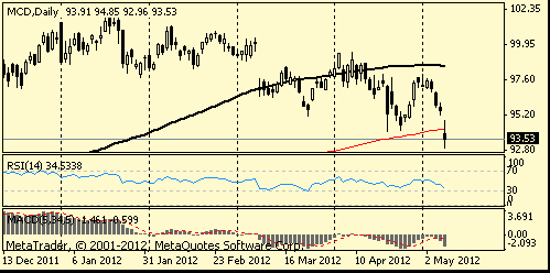 Акции крупнейшей сети фаст-фудов в мире McDonald’s Corp. (MCD) упали на 2,1% после того, как продажи в апреле не дотянули до прогнозов аналитиков. Так, продажи в США выросли на 3,3%, в то время как аналитики ожидали рост на 5,2%.