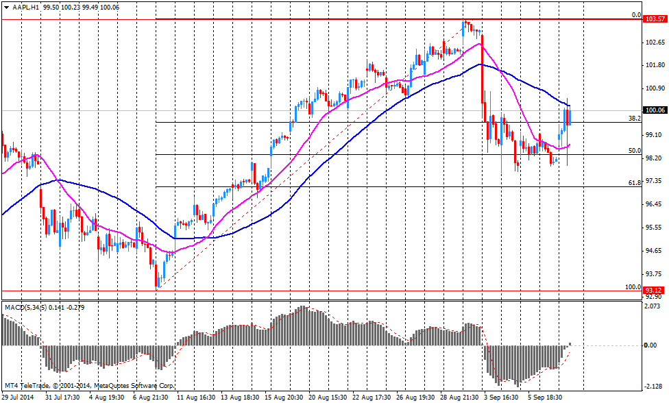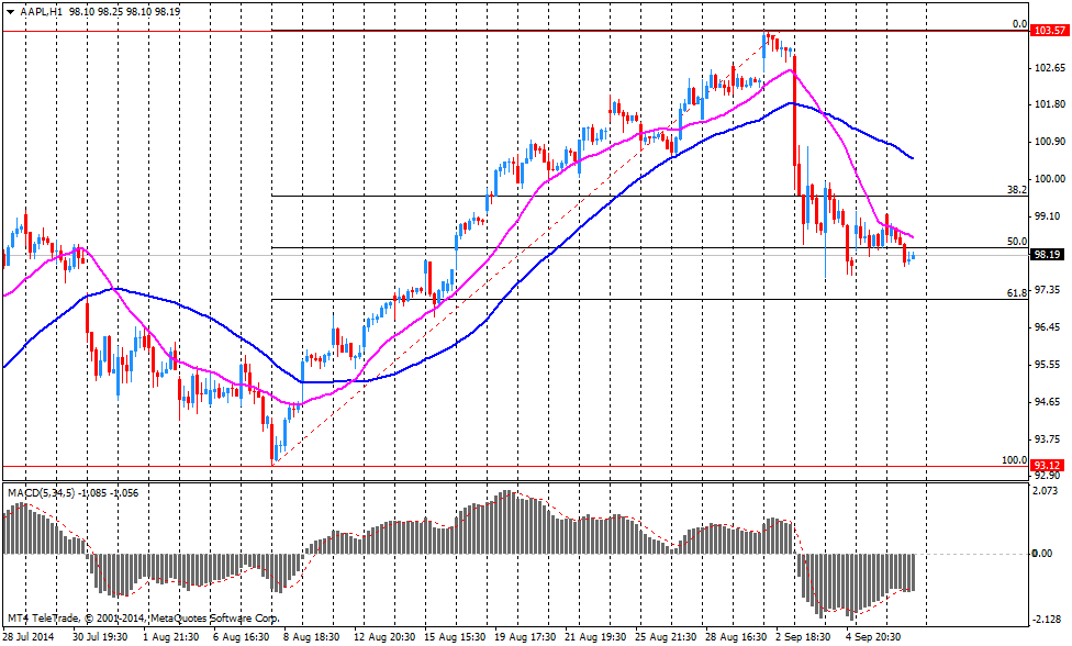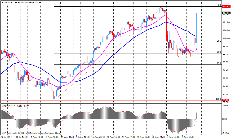 Поддержку акциям оказывает представление нового поколение смартфонов iPhone. Было представлено сразу две модели - младшая iPhone 6 и старшая iPhone 6 Plus, первая получила диагональ экрана 4,7 дюйма, вторая - 5,5 дюйма. При этом обе версии стали тоньше предшественников. В новых смартфонах используется новый 64-битный процессор Apple A8, который на 20% быстрее A7. Также была представлены новая платежная система Apple Pay.