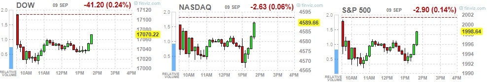 Во второй половине сессии индексы начали восстанавливаться, получив поддержку от роста акций компании Apple (AAPL), которая сегодня проводит масштабную презентацию. На момент подготовки материала акции AAPL поднялись до уровня $102,85, практически полностью компенсировав снижение прошлой недели.