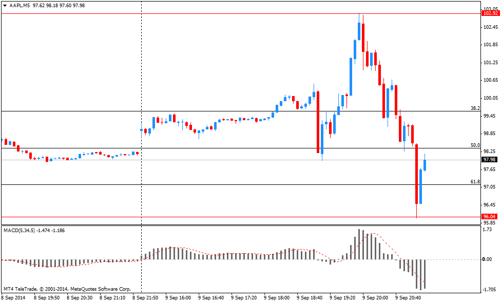 Судя по динамике акций, наибольшее разочарование принесла презентация "умных часов" Apple Watch, именно после этого акции начали стремительно дешеветь. Презентация iPhohe 6 также не очень воодушевила инвесторов (первая волна продаж). Наибольший интерес вызвала презентация платежной системы Apple Pay, именно после данной информации акции AAPL поднялись в область $103.