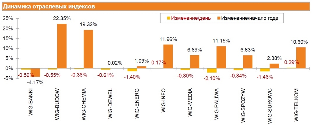 В отраслевом разрезе рост зафиксировали лишь бумаги компаний телекоммуникационного и IT секторов - соответствующие индексы WIG-TELKOM и WIG-INFO повысились на 0.29% и 0.17%. В тоже время наибольшее падение продемонстрировал индекс компаний топливной промышленности WIG-PALIWA, потерявший 2.10%.