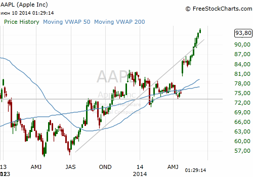 С момента объявления сплита 7 к 1 в конце апреля, акции AAPL выросли более чем на 20%.
