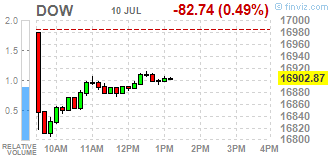 Компоненты индекса DOW торгуются преимущественно в плюсе (23 в минусе против 7 в плюсе). Наибольшее падение демонстрирует The Home Depot, Inc. (HD, -1.78%). Лидируют акции Verizon Communications Inc. (VZ +0.70%).