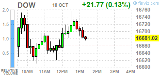 Большинство компонентов индекса DOW торгуются в плюсовой зоне (20 из 30). Аутсайдером являются акции Intel Corporation (INTC, -3.96%), а в авангарде - акции The Coca-Cola Company (KO, +1.72%).