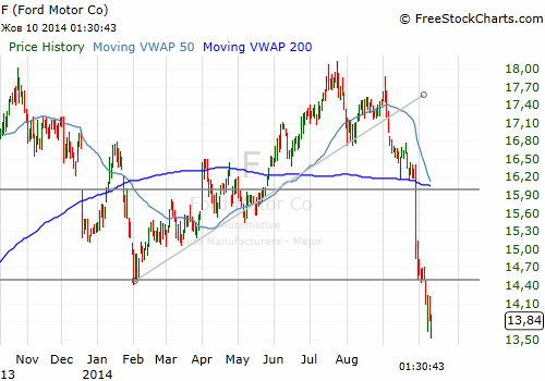 Недавняя распродажа акций Ford (F) была обусловлена снижением прогнозов прибыли компании. Падение было довольно резким, и Ford теперь торгуется более чем на $3 ниже котировок начала сентября. В настоящее время показатель P/E компании ниже 9.