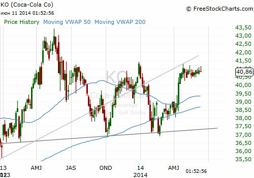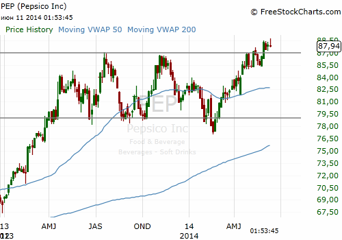 На текущий момент акции PepsiCo (PEP) котируются по $87.94 (-0,94%), а Coca-Cola (KO) по $40.84 (-0,56%)