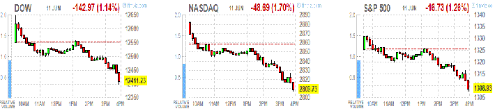 Фондовые индексы США упали, так как на смену оптимизму от плана спасения Испании пришел здоровый скептицизм, что подобными мерами не остановить долговой кризис.
