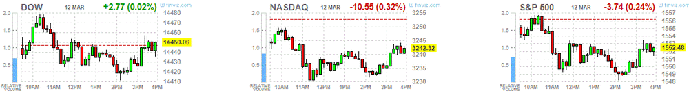 S&P -3.75 1,552.47 -0.24%Начав сессию в минусе, индексы отступили от сессионных минимумов, но все же завершили торги ниже нулевой отметки