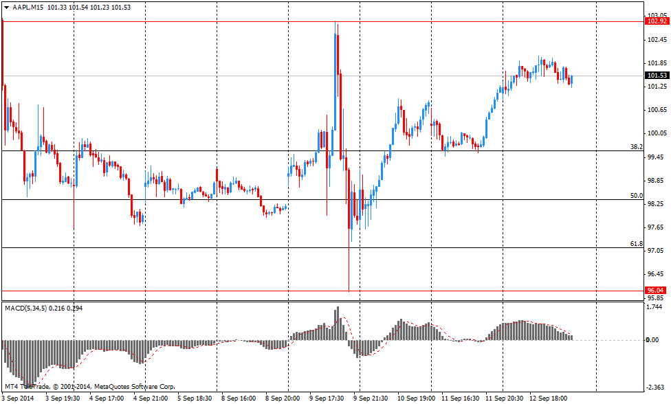 Основным корпоративным событием недели смело можно назвать масштабную презентацию новых продуктов компанией Apple (AAPL), прошедшую 9 сентября в Купертино. Apple представила новое поколение смартфонов iPhone. Было представлено сразу две модели - младшая iPhone 6 и старшая iPhone 6 Plus, первая получила диагональ экрана 4,7 дюйма, вторая - 5,5 дюйма. Также была представлены новая платежная система Apple Pay и "умные часы" Apple Watch. Судя по динамике цен акций AAPL в день презентации, инвесторы не оценили новинки Apple. Однако, на следующий день акции показали рост на более чем 3%, вернувшись при этом выше отметки $100. Росту акция способствовали сообщения о том, что Apple будет получать комиссионные от банков за подключение к к презентованной вчера платежной системе Apple Pay, а день спустя издание Financial Times сообщило о переговорах компании Apple с европейскими банками по внедрению ее системы бесконтактных платежей (Apple Pay) в Европе.