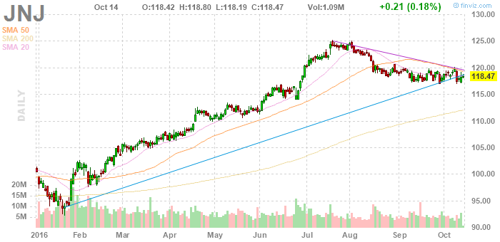 Johnson & Johnson (JNJ) является одной из крупнейших фармацевтических компаний по размеру выручки в мире. Компания намерена опубликовать финансовые результаты за третий квартал 2016 финансового года 18 октября 2016 года. По оценкам аналитиков, прибыль на акцию (EPS) составит $1,65.