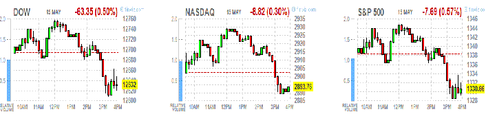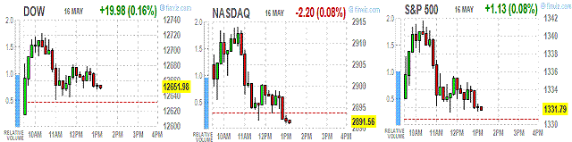 Фондовые индексы США снизились, не сумев удержаться на положительной территории, так как падение сырьевых акций и проблемы в Греции перевесили позитив от американских и европейских статданных.