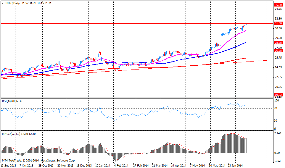 Акции INTC на премаркете выросли до уровня $33.21 (+4.73%), достигнув максимального уровня за более чем 10 лет. Выше текущих уровней сопротивлением акциям может оказать область отметки $35 (область максимумов 2003-2004 годов).
