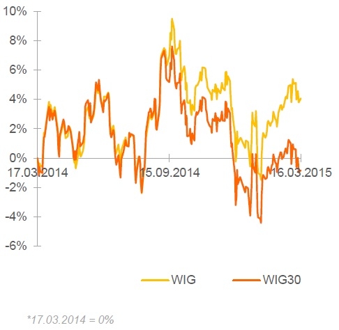 Отметим, что день был насыщенный корпоративными сообщениями, которые влияли на котировки отдельных эмитентов. В частности, подорожали бумаги банка PKO BP (WSE: PKO; +1.58%) благодаря хорошим финансовым результатам за 2014 год, превысившим прогнозы аналитиков. Котировки компании ENERGA (WSE: ENG) повысились на 2.02% на хорошей отчетности за 2014 год и оптимистичных прогнозах на 2015 год. Акциям KGHM (WSE: KGH; +0.61%) поддержку оказала новость о выплате дивидендов в размере 4 PLN на акцию (доходность дивидендов составляет 3.5% в пересчете на цену закрытия в пятницу). О намеренности выплатить дивиденды за 2014 год также заявили TAURON PE (0.15 PLN на акцию; дивидендная доходность составляет 3.3%) и Asseco Poland (2.90 PLN на акцию; дивидендная доходность - 5.1%). Компания TVN (WSE: TVN; -0.39%) сообщила о продаже крупнейшими акционерами компании ITI и Canal+ 52.7%-ного пакета акций американской компании Scripps Networks за 584 млн. евро. Стоимость пакета подразумевает цену за акцию на уровне 13.5 PLN (против 18.07 PLN на закрытии в пятницу). Однако стоит отметить, что покупатель также берет на себя обязательства по облигациям компании общей номинальной стоимостью 840 млн. евро.