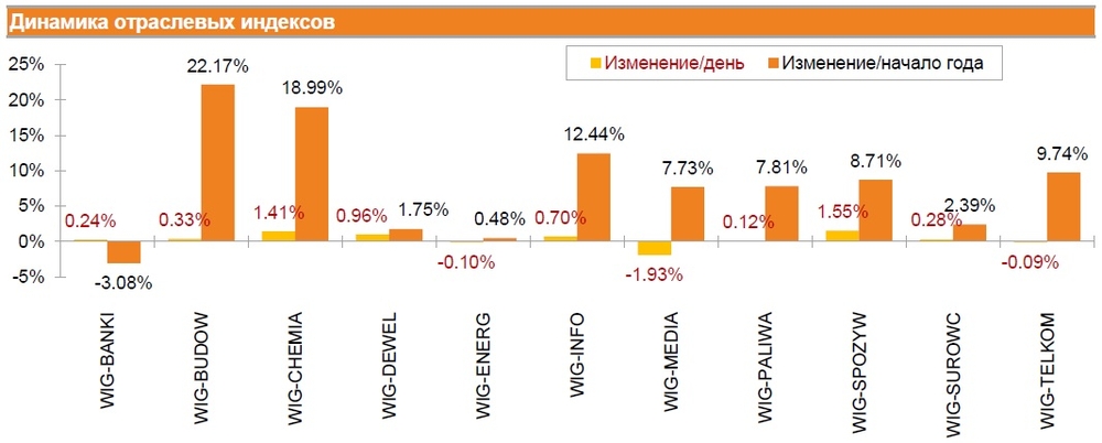 Среди отраслей наибольший рост был зафиксирован в пищевой промышленности, - соответствующий индекс WIG-SPOZYW вырос на 1.55%. Напротив, наибольшее падение продемонстрировали компания медиасектора, - индекс WIG-MEDIA снизился на 1.93%.