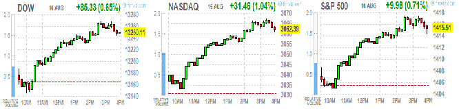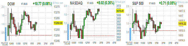 Индексы демонстрируют небольшой рост не смотря на то, что более более позитивные макроэкономические данные снижают шансы на новые вливания ликвидности со стороны ФРС. Ожидания новых стимулирующих мер со стороны федрезерва уже заложено в цену акций. Многие полагают, что о новых мерах будет объявлено уже на сентябрьском заседании Комитета по открытым рынкам.Участники рынка ожидают встречи глав центральных банков в Джексон Хоуле, которая должна состоятся в конце месяца.