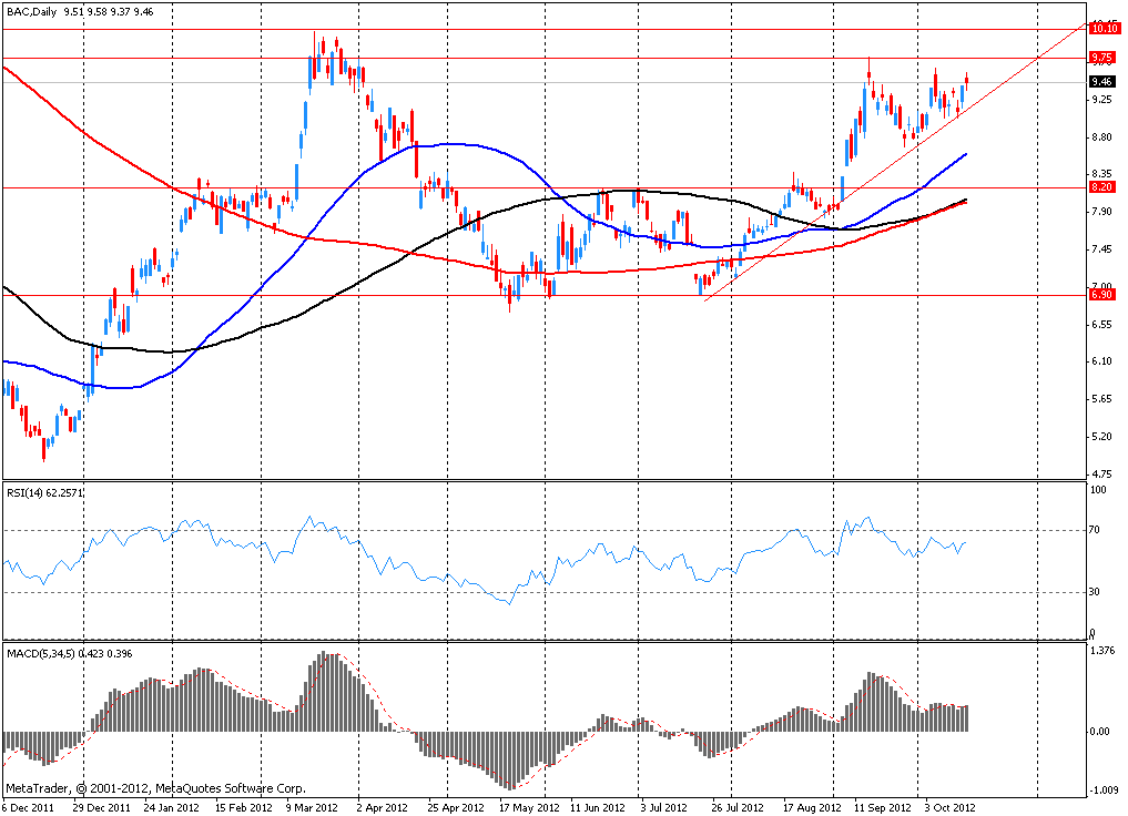 Акции BAC находятся в области максимумов октября, выше расположена область сопротивления $9.75 (максимум сентября).