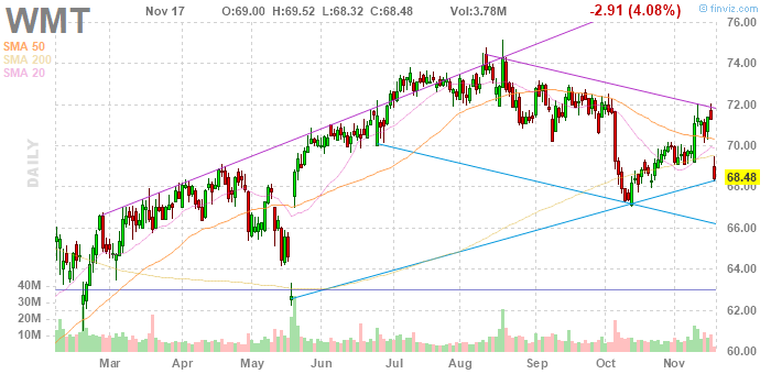 На текущий момент акции Wal-Mart (WMT) котируются по $68,48 (-4,08%)