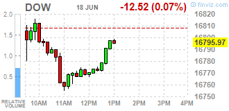 Компоненты индекса DOW торгуются преимущественно в плюсе (7 в минусе против 23 в плюсе). Наибольшее падение демонстрирует Intel Corporation (INTC, -0.30%). Лидируют акции The Coca-Cola Company (KO, +1.28%).