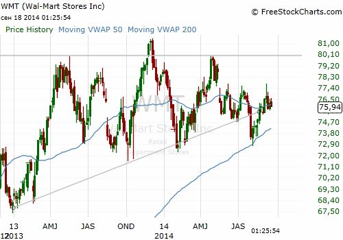 На текущий момент акции (Wal-Mart) котируются по $75.96 (-0,37%)