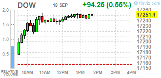 Большинство компонентов индекса DOW торгуются в плюсовой зоне (26 из 30). Аутсайдером являются акции Chevron Corporation (CVX, -0.55%). Больше остальных выросли акции E. I. du Pont de Nemours and Company (DD, +2.61%).