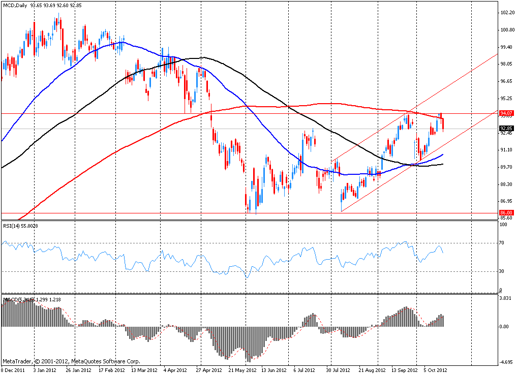Стоит отметить, что для продолжения роста, акциям MCD следует сначала преодолеть сильное сопротивление в области октябрьского и сентябрьского максимума $94.00/10.Снижением отреагировали Фондовые индексы Европы на результаты саммита ЕС. . На данный момент известно, что принято решение о создании европейской системы банковского надзора в 2013 году. Участники встречи в верхах также обсудили ситуацию в Греции.