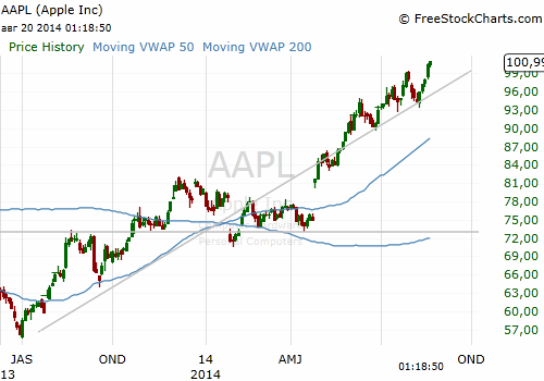 Как можно увидеть на графике ниже, Apple близится к самому высокому уровню, который был установлен в конце 2012 года. За это время акции компании падали до уровня $380, учитывая дробление акций AAPL 1:7. Покупатели в этом диапазоне близки к удвоению своих инвестиций всего за два года.