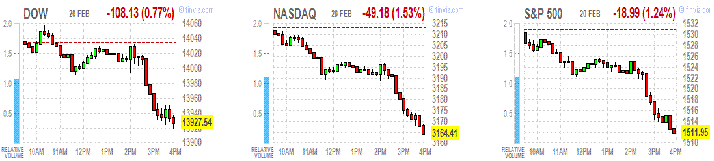 Большинство компонентов индекса DOW завершили торги в минусе (24 из 30). Более 3% потеряли акции Bank of America Corporation (BAC, -3.20%) и Alcoa, Inc. (AA, -3.31%). Лидером стали акции Merck & Co. Inc. (MRK, +1.04%).