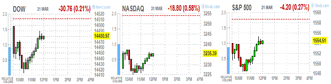 Индексы находятся в минусе, хотя и сократили свои потери. Давление на индексы оказывают опасения относительно ухудшения ситуации в европейской экономике, о чем сегодня засвидетельствовали индексы PMI, нерешенность вопроса с выделение финпомощи Кипру и ряд корпоративных отчетов.
