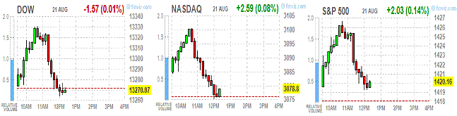 S&P 500 1,418.10 -0.06 -0.00%Основные фондовые индексы США отступили от сессионных минимумов, но все же завершили сессию с небольшим минусом.