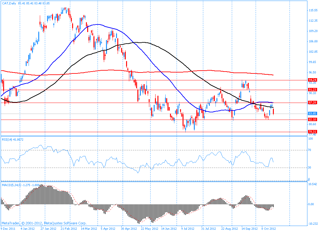 Сегодня квартальный отчет представила компания Caterpillar (CAT), которая является один из крупнейших в мире производителей спецтехники (см. материал, опубликованный в 12:30 GMT). Прибыль в расчете на одну акцию оказалась выше прогнозов, однако выручка оказалась ниже ожиданий. При этом, компания понизила прогнозы по финансовых показателя на 2012 и 2013 года.
