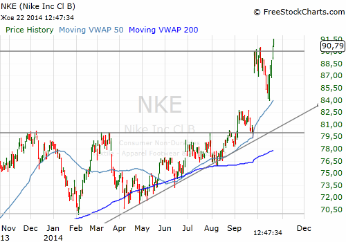 На текущий момент акции Nike (NKE) котируются по $91.07 (+0.47%)