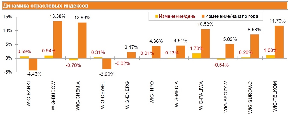 В отраслевом разрезе снижения претерпели лишь индикатор бумаг химической отрасли WIG-CHEMIA (-0.70%), индекс пищевой промышленности WIG-SPOZYW (-0.54%) и энергетический индекс WIG-ENERG (-0.02%). Наибольший рост продемонстрировали индексы бумаг топливной промышленности WIG-PALIWA и телекоммуникационного сектора WIG-TELKOM - 1.78% и 1.08% соответственно.