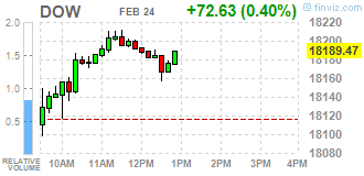 Компоненты индекса DOW торгуются преимущественно в плюсе (23 из 30). Аутсайдером являются акции UnitedHealth Group Incorporated (UNH, -0.78%). Больше остальных выросли акции The Home Depot, Inc. (HD, +4.46%).