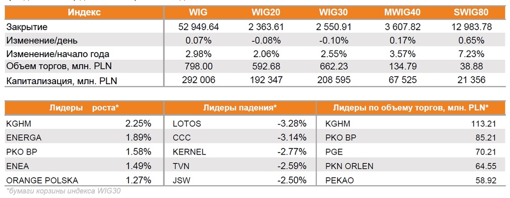Индикатор наиболее ликвидных бумаг WIG30, в отличие от индекса широкого рынка, завершил день незначительным снижением, которое составило 0.10%. Единого тренда среди бумаг корзины индекса не прослеживалось. С наилучшим результатом закрылась KGHM (KGH-WA), акции которой выросли на 2.25%. Несколько в меньшей степени подорожали бумаги ENERGA (ENG-WA) - на 1.89%. В тоже время значительнее всего подешевели бумаги компаний LOTOS (LTS-WA) и CCC (CCC-WA) - на 3.28% и 3.14% соответственно.